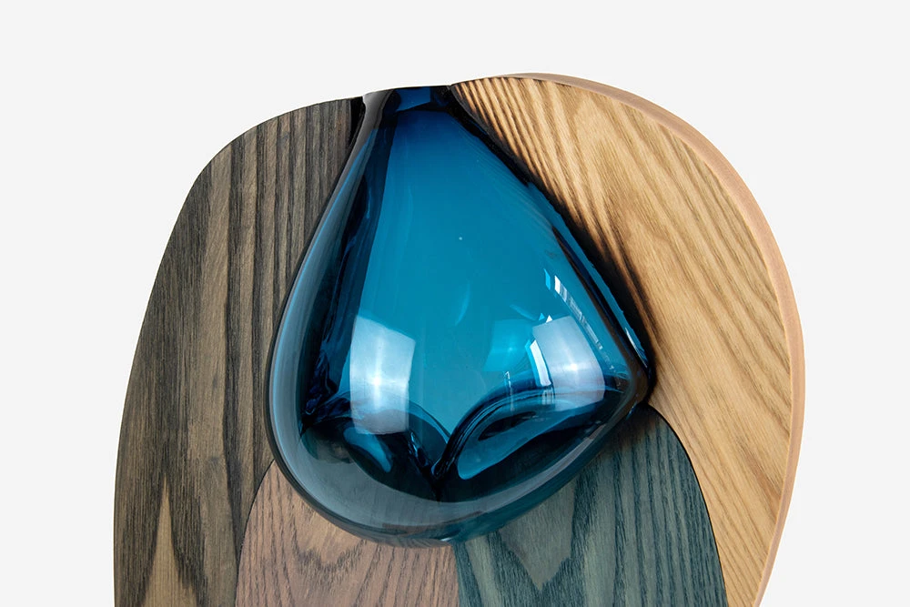 Midnight Blue is made from ash, Douglas fir, oak, reclaimed wood and hand-blown glass. This unique sculpture is hand-painted in water-based paint and finished in a clear, natural lacquer.
