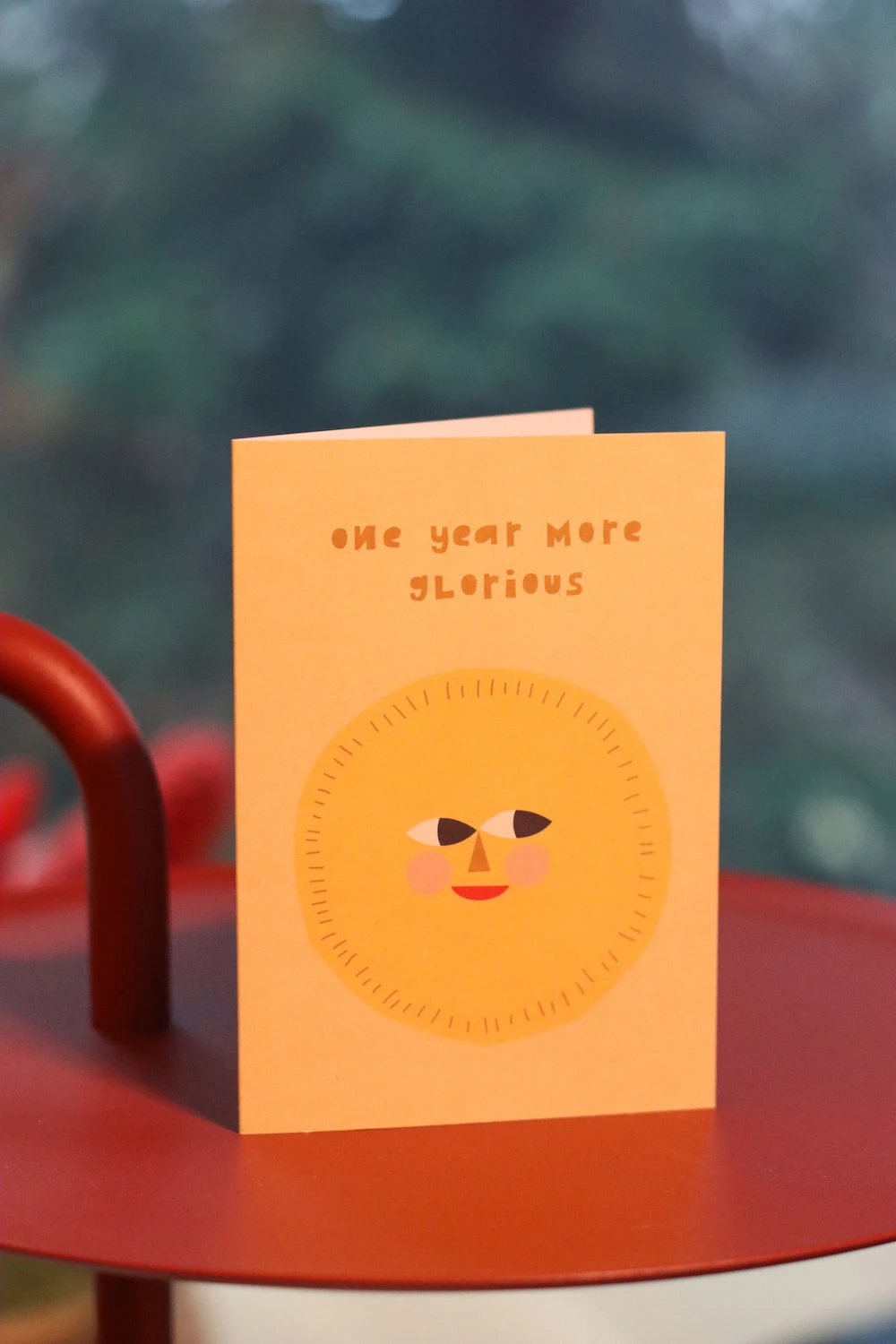 Celebrate someone ageing in style with this sunny birthday card. Left blank inside for your own message.