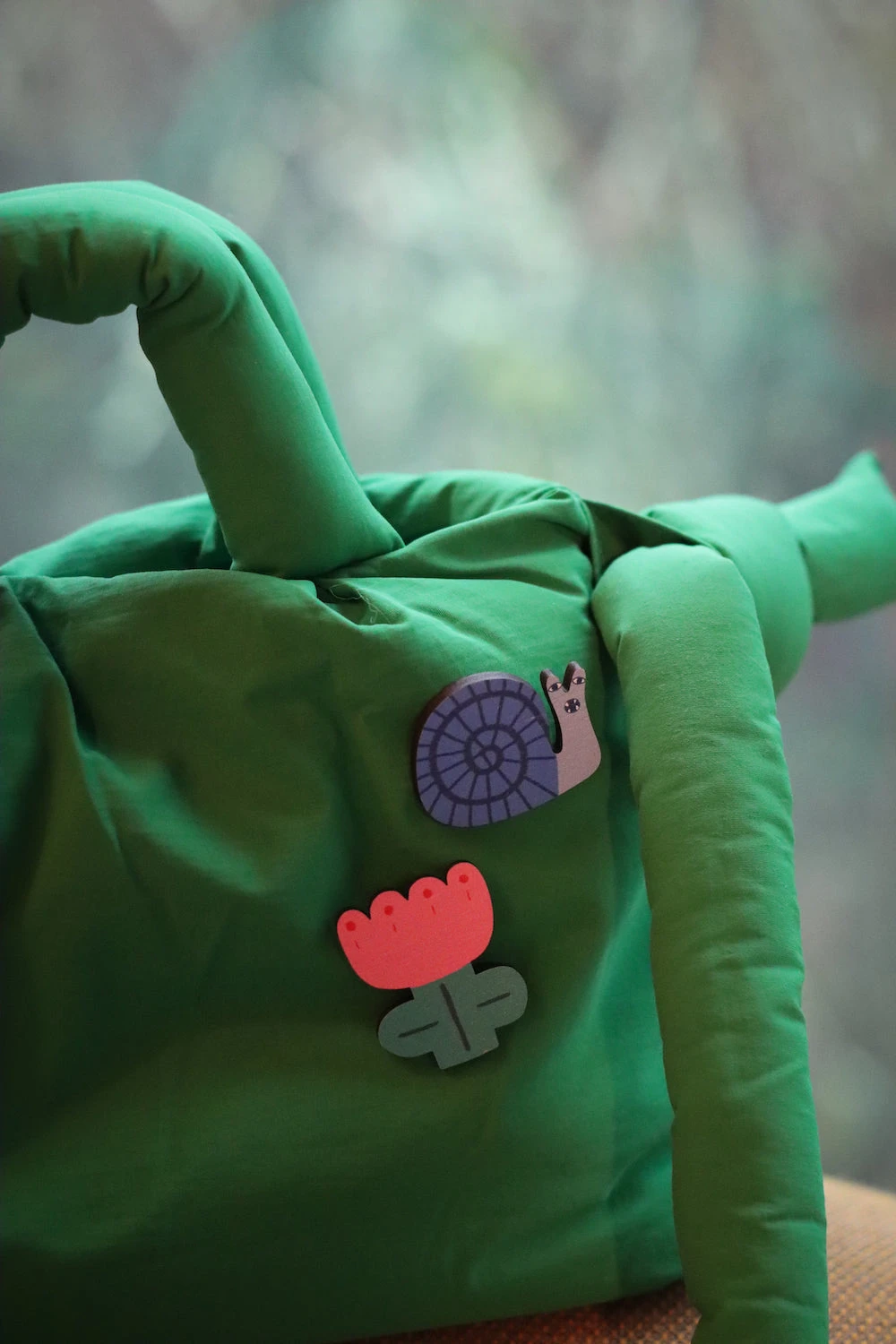A printed wooden pin badge in the shape of our slowest creature, Sylvie Snail.